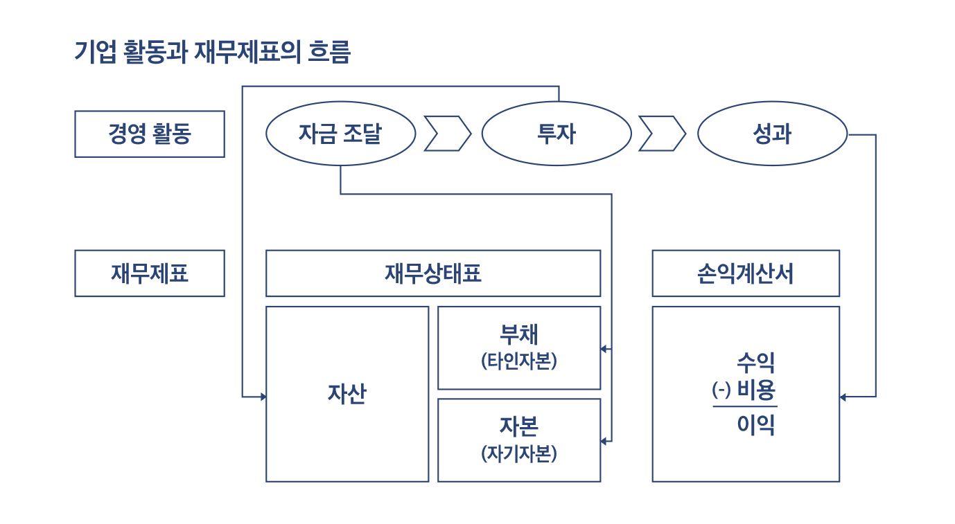 회사의 경영 활동은 일반적으로 ‘자금 조달–투자–성과’의 순서로 이어진다. 경영 성과를 얻으려면 선행적으로 투자가 이루어져야 하고, 투자하려면 자금이 필요하므로 먼저 이를 조달해야 한다. 회사의 재무상태표와 손익계산서는 바로 이런 경영 활동을 들여다볼 수 있는 도구에 해당하며 다음 그림과 같이 나타난다.