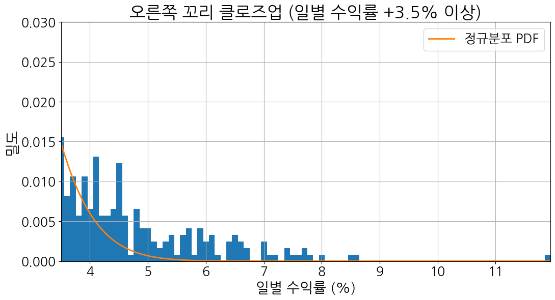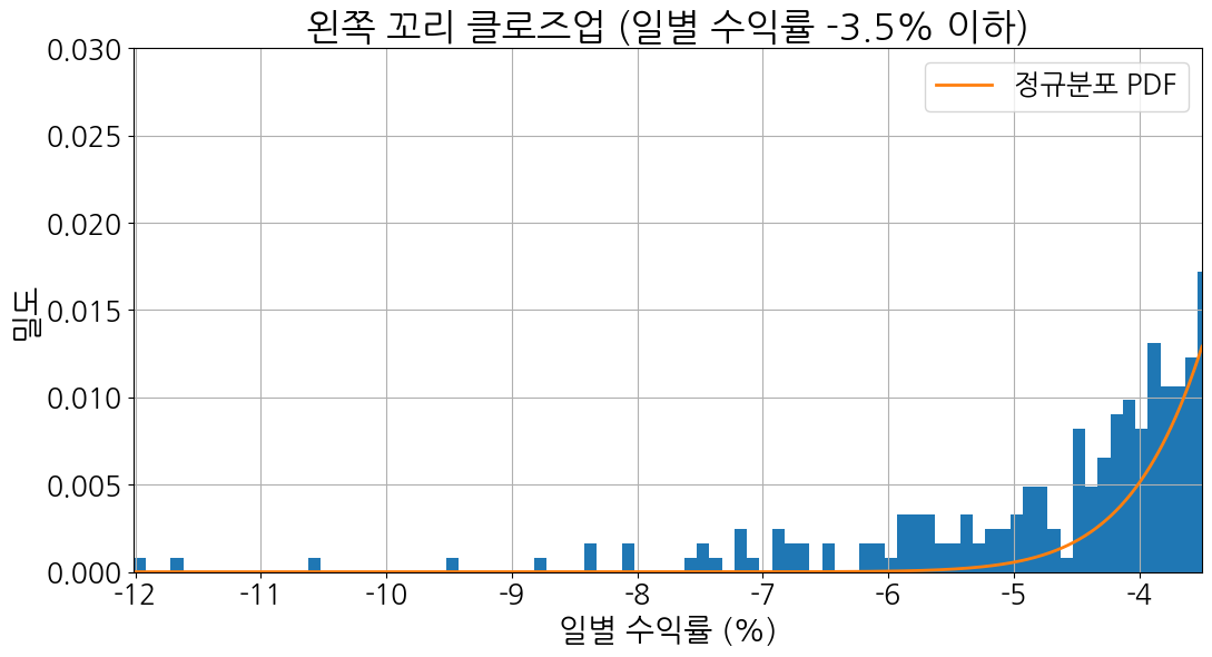 그림 2와 그림 3은 각각 코스피지수 일별 수익률의 왼쪽과 오른쪽을 확대한 확률분포의 일부다. 주황색 선은 정규분포 함수인데, 왼쪽과 오른쪽 극단으로 갈수록 거의 0%에 수렴한다. 그러나 파란색 히스토그램 막대는 아랑곳하지 않고 두더지처럼 고개를 내밀고 있다.