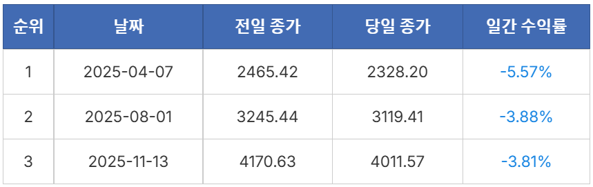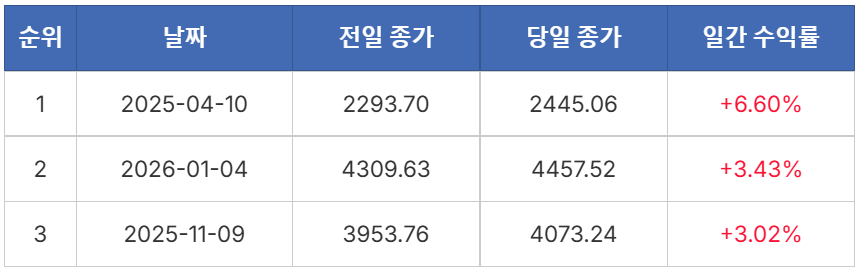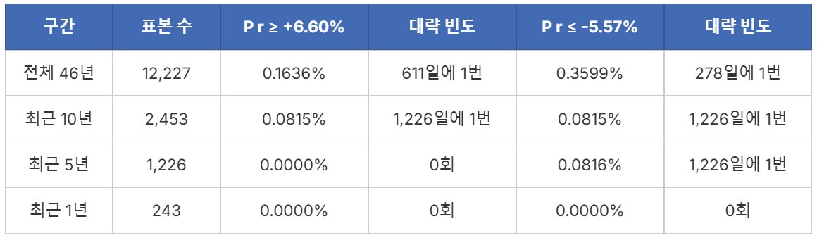 ※ 최근 1년, 코스피 4000 시대가 열린 기간도 살펴보자. 최근 1년 중 최대 일간 상승률인 +6.60%는 영업일 기준 611일에 한 번 일어날 확률(0.1636%)의 사건이다. 최대 일간 하락률 –5.57% 역시 278일에 한 번 일어날 확률(0.3599%)로, 두 경우 매우 이례적인 변동에 해당한다. 단순히 ‘많이 올랐다’거나 ‘많이 내렸다’고 표현하는 대신, 역사적 데이터를 기준으로 보면 이러한 변동이 정량적으로 어느 정도의 특수한 상황인지 가늠해볼 수 있다. +6.60% 상승은 최근 10년간의 거래일(2,453일)을 기준으로 보더라도 1,226일에 1번, 즉 최근 10년을 통틀어도 두 차례 발생했을까 말까 한 상당히 이례적인 확률의 사건임을 알 수 있다.