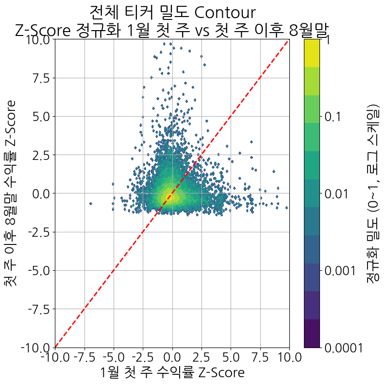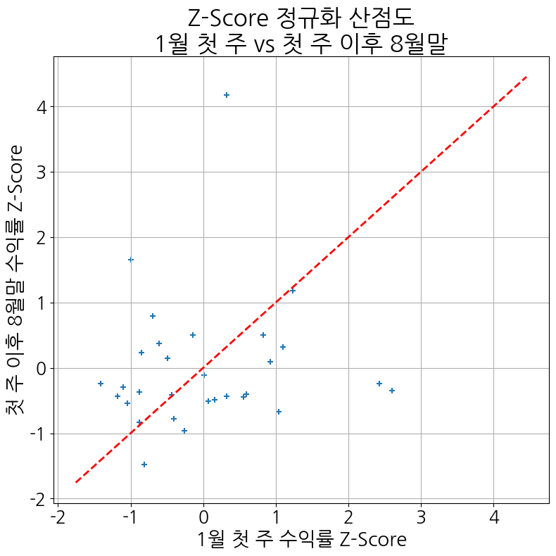 바로 검증에 나섰다. 한국 주식시장 전체 주식의 가격 데이터와 함께 내가 이해한 바를 GPT에 일상 언어로 표현하여 검증을 요청했다. 먼저 삼성전자 한 종목에 대해 매년 1월 첫 주의 상승률과 그 이후부터 8월 말(상반기)까지의 주가 변화의 상관성을 살폈다. 30년에 걸친 분석에서 상관성은 오히려 역의 상관관계로 나왔다.